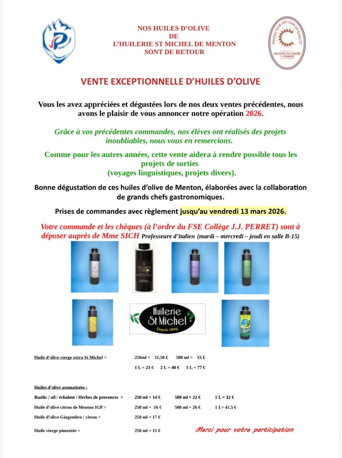 Acheter des produits au bénéfice du Foyer socio éducatif et des voyages - Les chèques sont à remettre à la vie scolaire . Les bons de commandes ont été remis aux élèves. Merci de votre participation !!